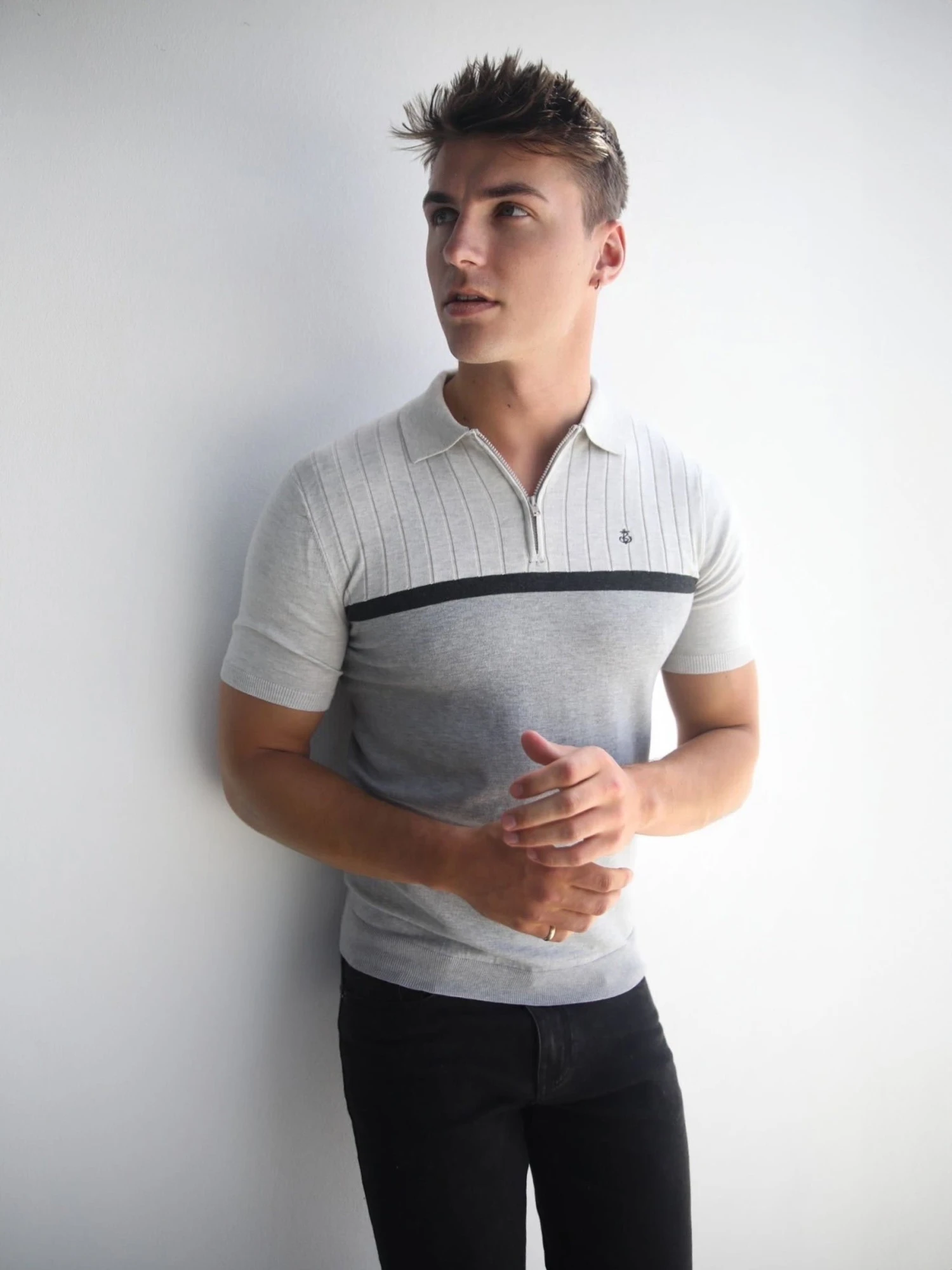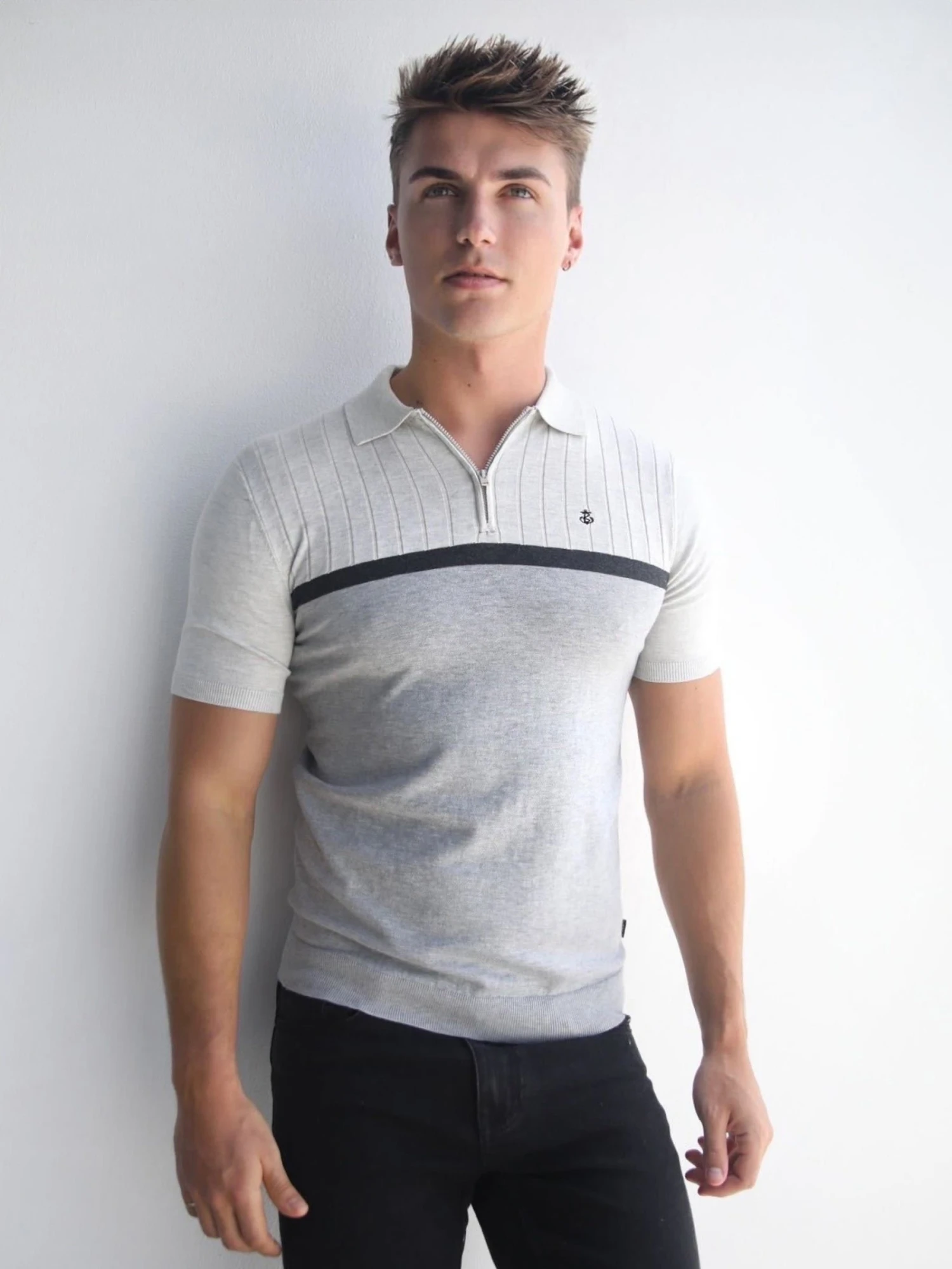 The Antonio Polo in grey has a slim fit with ribbed texture at the top and variation in colour throughout. It features a zip polo collar and is finished with an embroidered Anchor logo in black on the chest, as well as ribbed hem and cuffs.