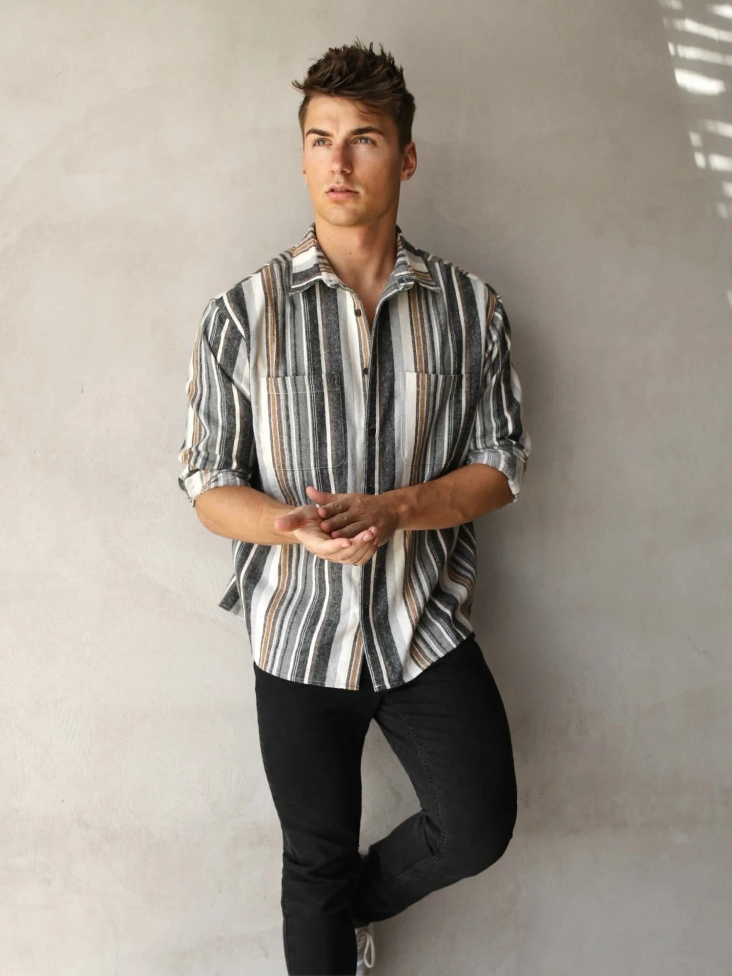 The Lucca Stripe Shirt in grey features a long-sleeve design and relaxed fit. Featuring front pockets, a striped pattern and crafted from a slightly heavier weight fabric, this is the ideal summer evening layer.