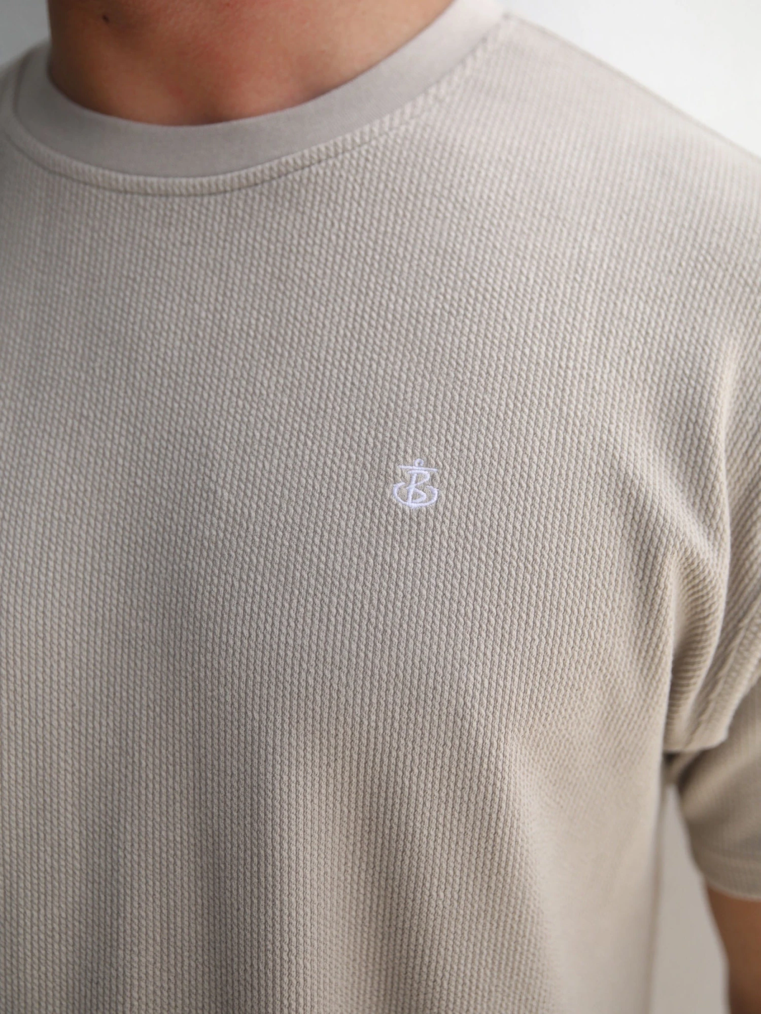 The Matteo T-Shirt in tan has a relaxed fit, with a subtle ribbing texture, and short sleeves. It has a crew neck collar, and is finished with an embroidered Anchor logo in white to the chest and branded tab to the side seam line.