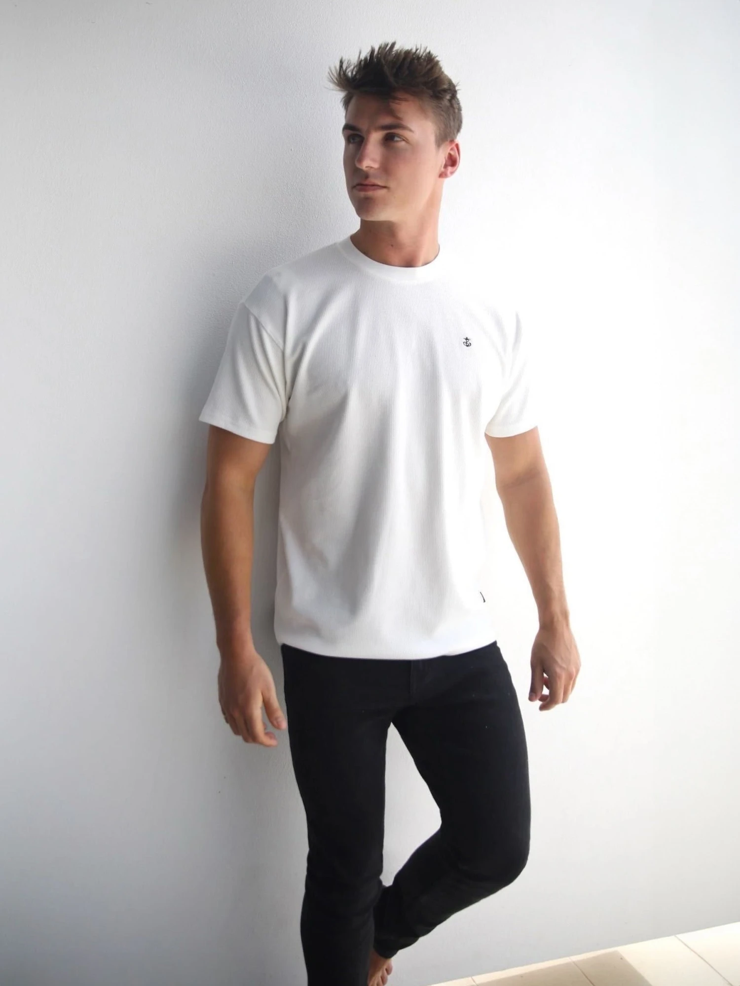 The Matteo T-Shirt in white has a relaxed fit, with a subtle ribbing texture, and short sleeves. It has a crew neck collar, and is finished with an embroidered Anchor logo in black to the chest and branded tab to the side seam line.