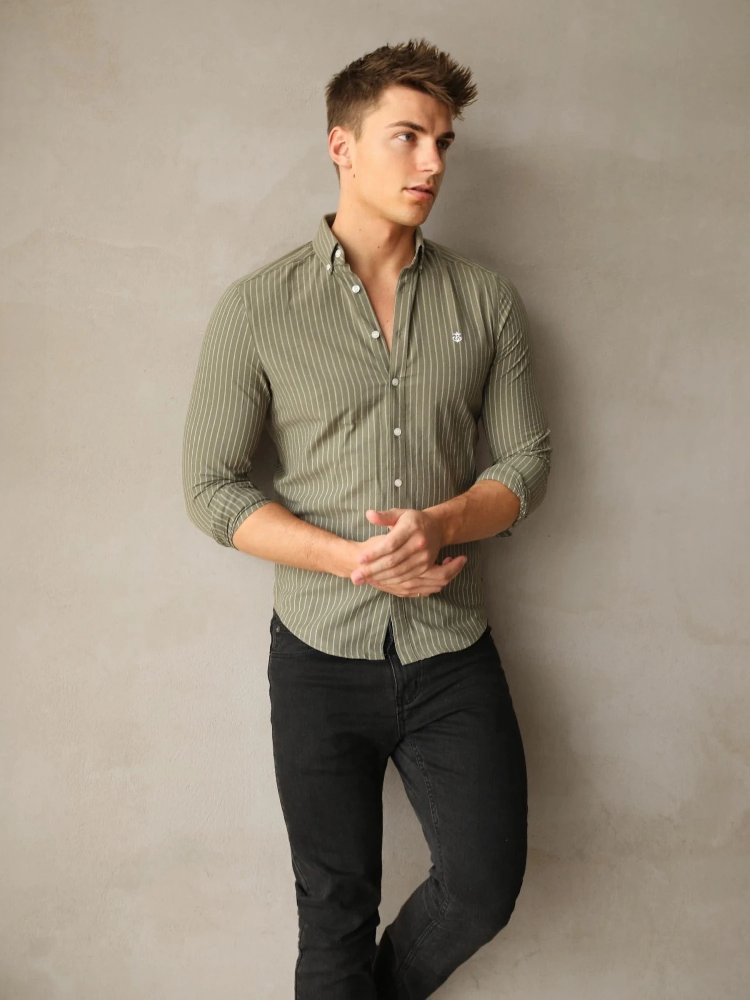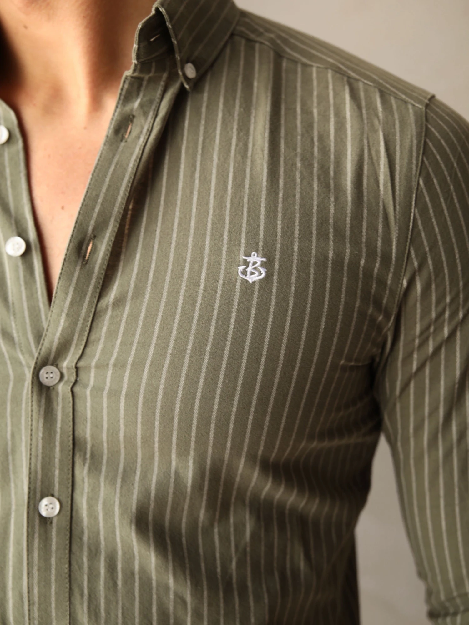 Introducing the Modena Shirt in khaki. This slim-fit shirt features a striped pattern throughout. It is crafted from a lightweight cotton blend, making it perfect for summer wear. It has a full summary-up design and is finished with our Anchor logo in white embroidered on the chest.