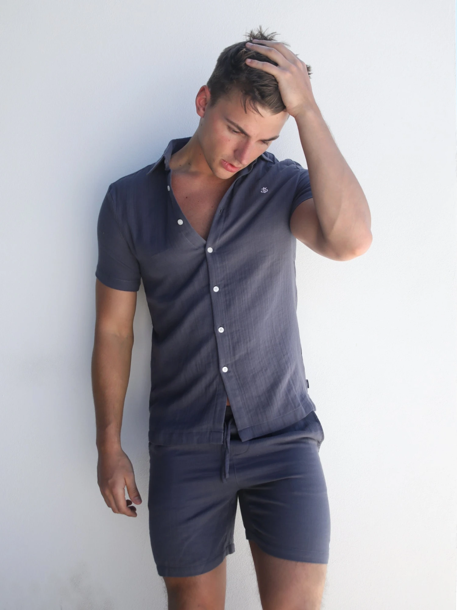 Introducing the Siena Shorts in navy. They are made from a breathable textured fabrication and have a slightly relaxed fit. These shorts have been finished with a embroidered Blakely Anchor logo, side pockets, and an elastic waistband.