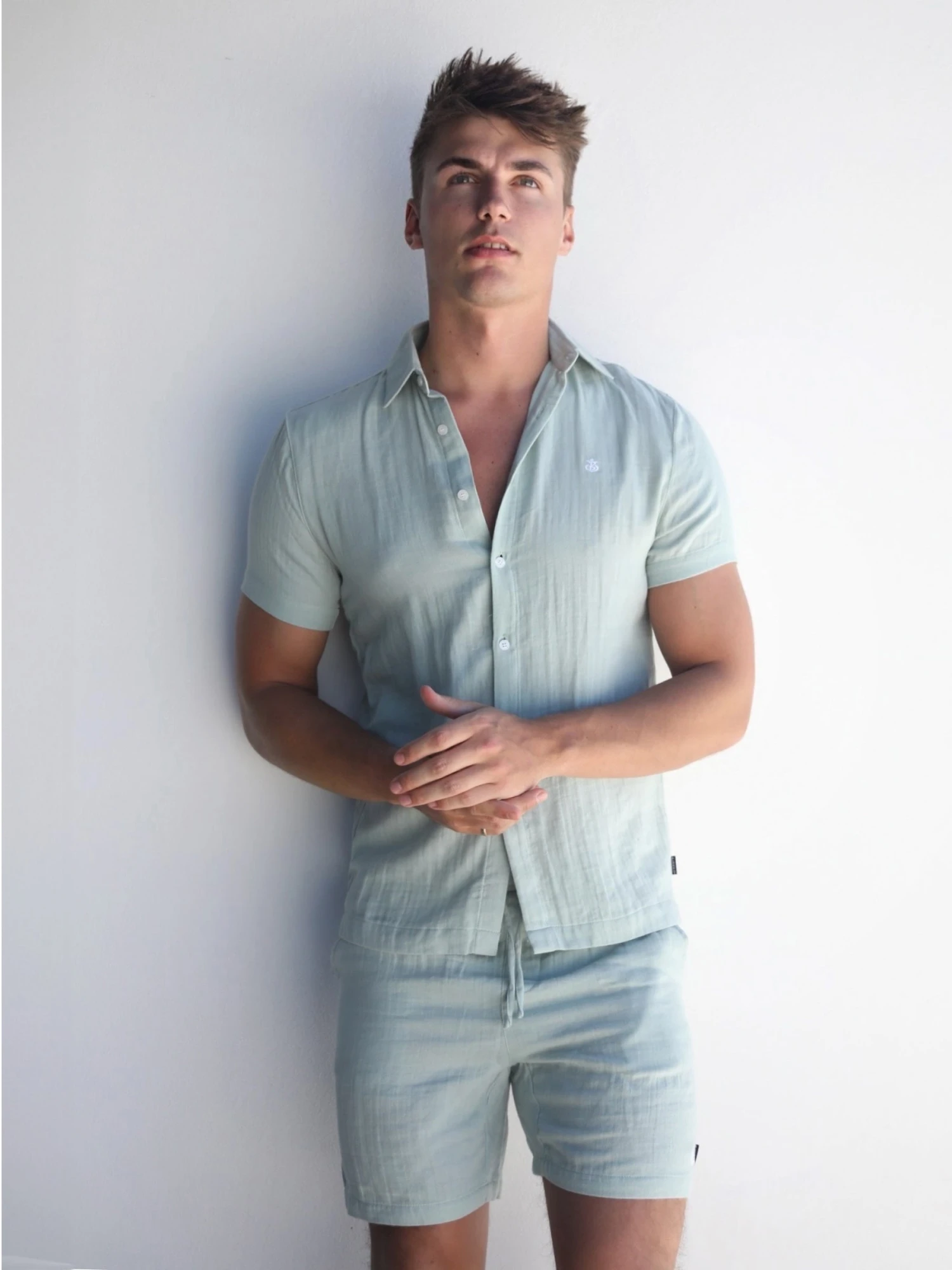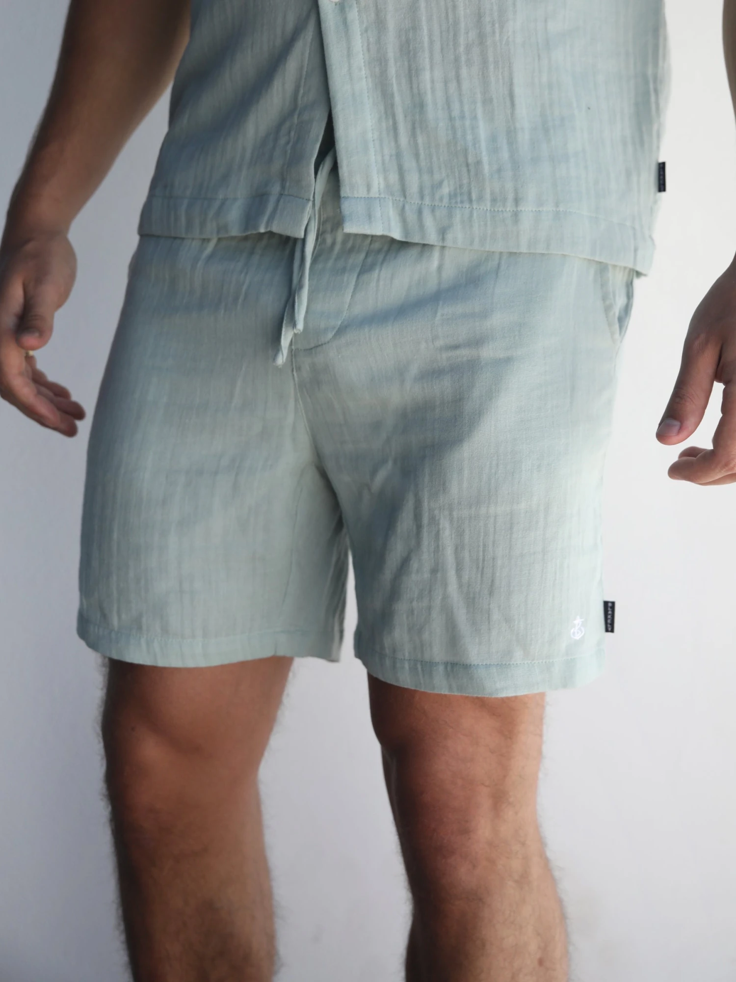 Introducing the Siena Shorts in sage green. They are made from a breathable textured fabrication and have a slightly relaxed fit. These shorts have been finished with a embroidered Blakely Anchor logo, side pockets, and an elastic waistband.