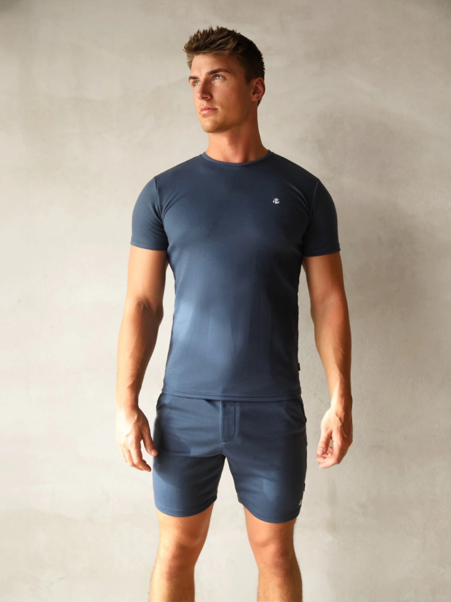 Our Sorrento T-shirt in navy is a slim fit tee made from a soft fabric blend. It features a crew neck collar and is finished with an embroidered Anchor logo on the chest. Pair with the matching shorts for a complete look.