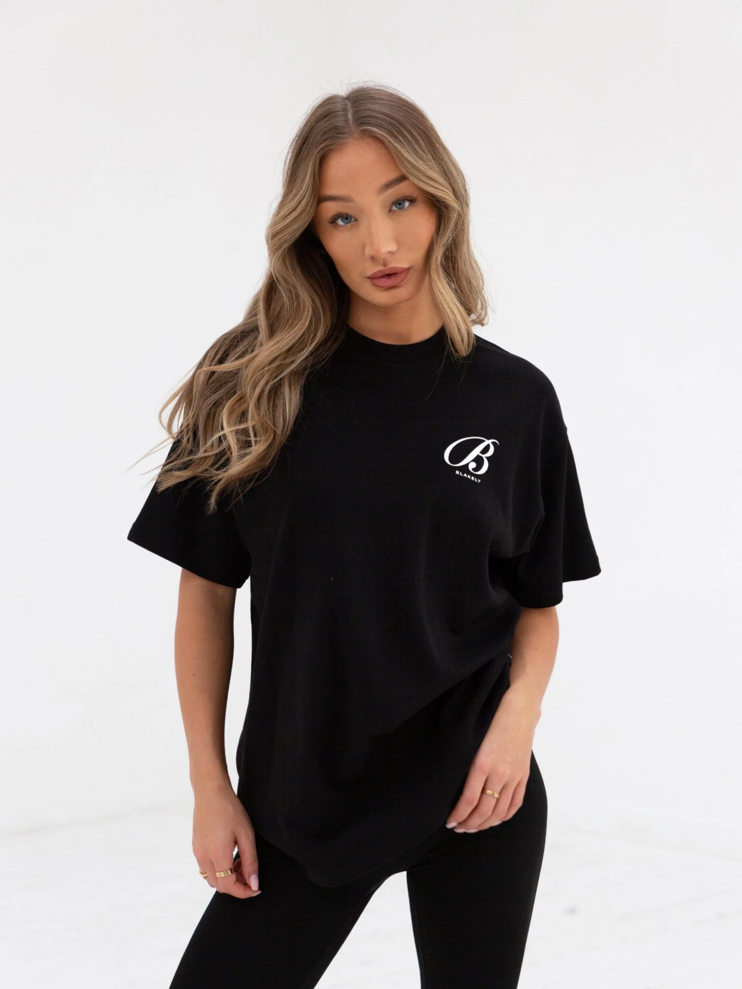 The Vita T-shirt in black is crafted from a cotton blend with a oversized fit. It has a crew neck collar and is finished with a graphic print in flat white on the front & back.