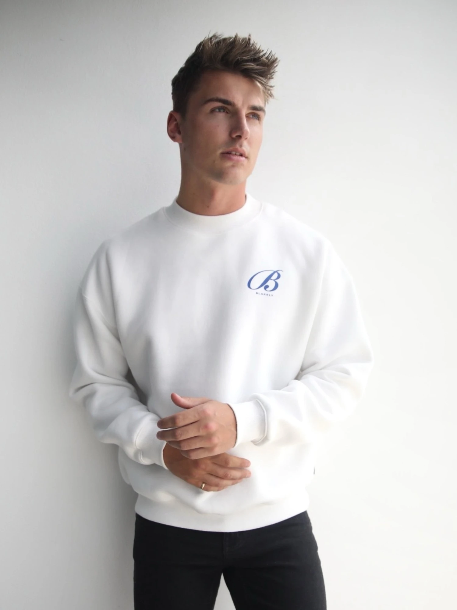 The Vita Jumper in flat white is crafted from a cotton blend with a relaxed fit. It has a ribbed hem and cuffs and is finished with a large graphic print in cobalt on the back & front.